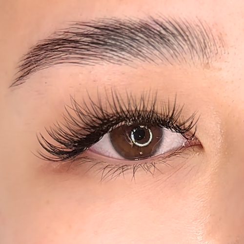 Gleichzeitig werden in bestimmten Bereichen oder gezielt einzelne Wimpern Volumen-Extensions hinzugefügt. Diese Volumenwimpern bestehen aus mehreren sehr dünnen Wimpern, die zu einem Bündel zusammengefasst sind, um ein voluminöses, dichten Ergebnis zu erzielen. Durch die Kombination beider Techniken entsteht ein Look, der sowohl Natürlichkeit als auch Dramatik vereint.